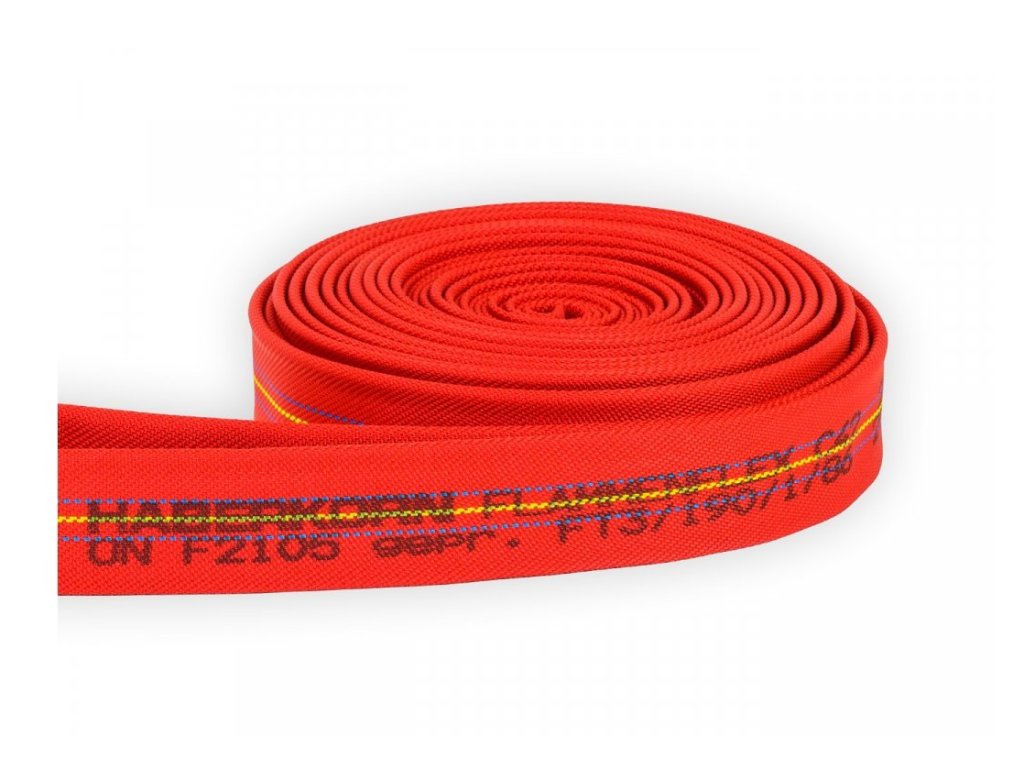 Požární hadice složená z polyesterové tkaniny a tenkostěnné pryžové vložky EPDM (Ethylen-Propylen-Dien) pro ideální průtok vody s minimální tlakovou ztrátou.